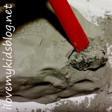 The clay gets quite messy as it is being worked on, so I would suggest either using the lid of the mining kit (which is what we did) or working on a cookie sheet or sidewalk. Doing that will help reduce the clean-up and make things a lot easier in the end.