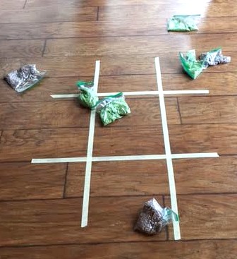1. Set up the tic tac toe board with masking tape on the kitchen floor.